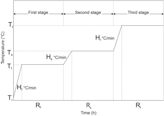 Three-stage segmented pyrolysis for spruce was done with final pyrolysis temperatures of 300 °C, 500 °C, 700 °C, and 900 °C (300S, 500S, 700S and 900S, S = Segmented). The temperature pattern of segmented pyrolysis is shown in Figure 2. The Tr refers to room temperature; Tf, Hf, and Rf refer to pyrolysis temperature, heating rate, and residence time at the first stage. Ts, Hs, and Rs refer to pyrolysis temperature, heating rate, and residence time in the second stage. Respectively, Tt, Ht, and Rt refer to pyrolysis temperature, heating rate, and residence time in the third stage.