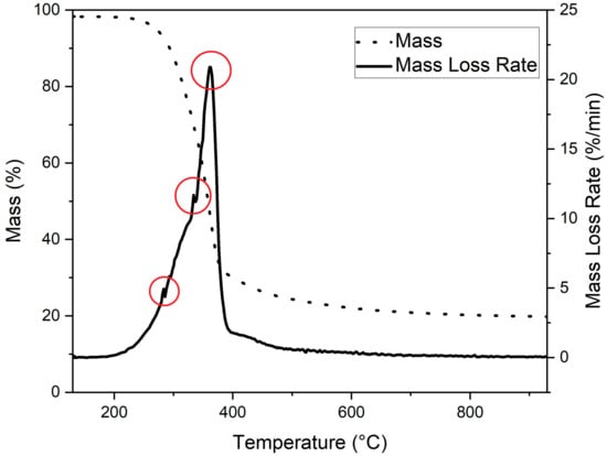 The thermogravimetric (TG) curve and the first derivative of the TG (DTG) curve of milled spruce are shown in Figure 3. As Figure 3 shows, the main degradation of spruce occurred at temperatures from 250 °C to 390 °C, where three major decomposition peaks can be observed at temperatures of 283 °C, 333 °C, and 362 °C. Those peaks are highlighted using red circles in Figure 3.