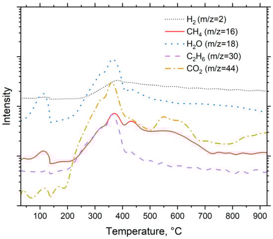 As seen in Figure 4, the m/z signal 2 was identified as a hydrogen (H2) and its signal reaches its peak at around 360 °C. This peak is related to decomposition of cellulose into C-H groups [36]. The m/z = 16 was identified as methane (CH4). Methane has two main peaks. These peaks occur at temperatures around 360 °C and 430 °C. The peak at 360 °C most likely originates from decomposition of cellulose, and the peak at 430 °C from decomposition of lignin [36,37]. The signal m/z = 18 was identified as water (H2O). Water has two peaks. The first one occurs at temperature around 105 °C and is related to release of the moisture from the feedstock. The second peak around 360 °C is caused by the decomposition of oxygen-based functional groups [36]. The signal m/z = 30 was identified as an ethane (C2H6). It has two main peaks, at 360 °C and 450 °C. The first one most likely originates from the decomposition of cellulose and the latter from the decomposition of lignin. The m/z = 44 was identified as carbon dioxide (CO2) and has two main peaks: the first peak occurs at 360 °C, suggesting that it originates from the decomposition of cellulose, and the second peak occurs around 600 °C, which could be attributed to macromolecular cracking [36]. At 800 °C, the peak intensity growth is suggested to originate from the decomposition of carbonyl and carboxyl groups which occur around this temperature [36].