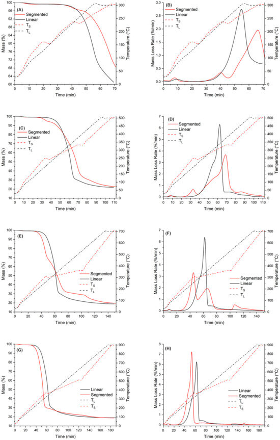 A thermogravimetric analysis was used to compare pyrolysis behavior between linear and segmented pyrolysis. The used programs were similar to those presented in Table 2, but instead of keeping the samples for 160 min at each holding stage, a 5 min holding time for each stage was applied. The difference between the pyrolysis behavior of these two methods is shown in Figure 5. As seen in Figure 5, there was a slight delay from the start of the program before the heating actually began. This delay was caused by the used device, because it took some time for the heating element to start heating the samples. Also, it is noteworthy that, especially in pyrolysis at temperatures of 300 °C and 500 °C, for segmented pyrolysis, the heating rate seems not to have been going as desired.