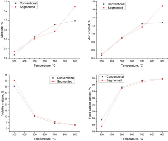 The results of the proximate analysis are presented in Figure 7. As Figure 7 shows, the moisture content of the biocarbons varied from 0.27% (300 °C) to 0.99% (900 °C) in conventional pyrolysis and 0.34% to 1.17% in segmented pyrolysis. Conventional pyrolysis leads to increased moisture content at the temperatures of 500 °C and 700 °C, and segmented pyrolysis leads to increased moisture content at the temperatures of 300 °C and 900 °C, respectively. In industrial storing conditions, the increase in moisture content could be even higher. The samples were stored in airtight containers, where the amount of moisture absorbed from air to biocarbon is limited. This is the ideal situation and, obviously, it is not possible everywhere. Wang et al. [41] reported that storing biocarbon at 98% relative humidity for 8 weeks increased biocarbon moisture content by 5.2%, leading to the biocarbon moisture content level being as high as 13.9%. It is reported in the literature that coke typically has a moisture content below 5% [1]. When taking into account this fact and the possibility that the moisture content increases during storage period, the material most likely needs to be dried before it is suitable to be used in metallurgical applications.
