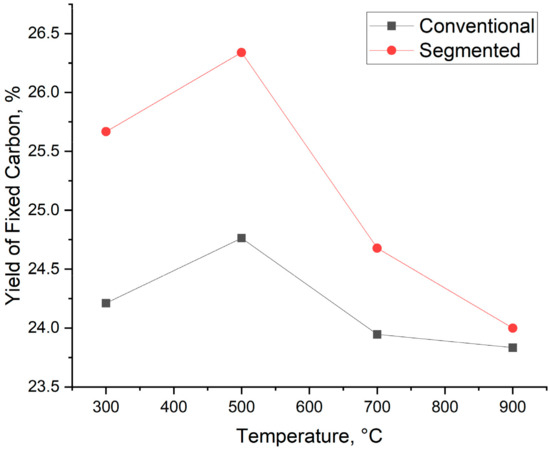 In addition to biocarbon yield and fixed carbon content, the yield of fixed carbon is also taken into account. Calculating the yield of fixed carbon not only takes into account the biocarbon yield but also the fixed carbon content of the samples. Because of this, it is easier to compare biocarbons produced with different temperatures, heating rates, and production technologies. The yield of fixed carbon is shown in Figure 8. The yield of fixed carbon varies from 24.76% to 23.83% for conventional pyrolysis and from 26.34% to 24.10% for segmented pyrolysis. The highest yield of fixed carbon is achieved at the temperature of 500 °C. When the temperature is over 500 °C, the yield of fixed carbon decreases for both methods. These results indicate that at 500 °C, the main reason behind the increased fixed carbon yield is the increased fixed carbon content of the samples. When the temperature is between 700 °C and 900 °C, the decrease in biocarbon yield is greater than the increased fixed carbon content, thus leading to a decreased yield of fixed carbon.
