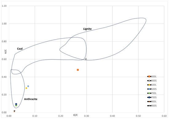 Figure 10 shows the calculated H/C and O/C values in the Van Krevelen diagram. The atomic O/C and H/C ratio of spruce biocarbons were in the range of 0.02–0.27 and 0.1–0.48 for conventional pyrolysis, respectively, and 0.02–0.30 and 0.02–0.60 for segmented pyrolysis, respectively. The results show that increasing pyrolysis temperature caused these values to decrease in both methods. The decrease in the ratios is linked to decreased content of oxygen and hydrogen and increased carbon content of the samples. Similar effects of pyrolysis temperature on H/C and O/C ratios have been reported in the literature [33,47].