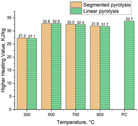 Figure 12 shows the evolution of higher heating values of biocarbons alongside the used reference heating value for pulverized coal. The heating value varied from 27.3 MJ kg−1 to 32.8 MJ kg−1 for biocarbons produced in segmented pyrolysis and from 27.1 MJ kg−1 to 32.8 MJ kg−1 for biocarbons produced conventionally. The heating value tends to decrease when the pyrolysis temperature is increased from 500 °C to 900 °C. This decrease could be caused by the increased ash content of the samples. It is reported in the literature that an increase in ash content by 1% reduces the calorific value by 0.2 MJ kg−1 [58]. The second possible explanation for this decrease is that because the samples have different carbon, hydrogen, and oxygen contents, the changes in the ratios between these substances directly affects the heating value of the biocarbons.