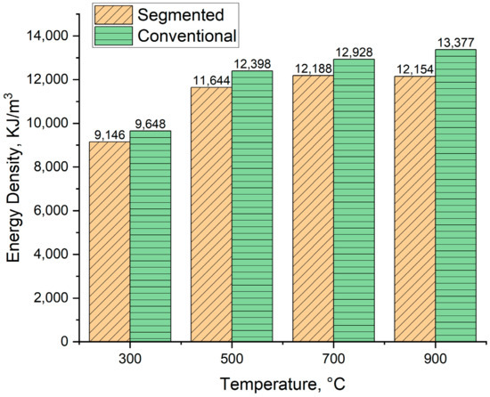 The calculated energy density of the produced biocarbons is presented in Figure 13. For segmented pyrolysis, the energy density varied from 9146 KJ/m3 to 12,188 KJ/m3, and in case of conventional pyrolysis, from 9448 KJ/m3 to 13,377 KJ/m3. In general, conventional pyrolysis produced biocarbons with higher energy density compared to segmented pyrolysis. As the pyrolysis temperature rises, so does the energy density for biocarbons produced in the conventional way. For segmented pyrolysis, the energy density tends to decrease when the pyrolysis temperature is increased from 700 °C to 900 °C. The decrease in energy density is linked to the decreased heating value in these temperatures. On the other hand, the energy density for biocarbons produced in conventional pyrolysis increases, although the heating value decreases when the pyrolysis temperature is increased from 700 °C to 900 °C. In this case, the decreased heating value is compensated by the increase in bulk density. These results show that in view of energy density, the most suitable temperature for segmented pyrolysis is 700 °C, and for conventional pyrolysis, 900 °C.