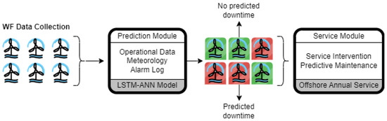 Predictive maintenance is a well-described topic in the literature, and it has many cases of successful implementation in several different industries [5,6,7]. Predictive maintenance typically consists of two main elements: a prediction model itself and a service planning model. The prediction model, often based on machine learning algorithms, is designed to learn patterns from historical data on WT downtime events and predict future downtime occurrences. These downtime events are any internal issues the WT experiences that require a shutdown of the WT operations, remote restart, and in some cases, manual corrective maintenance to restart the WT. These unplanned downtime events and the associated availability loss present a large production value loss [8,9].