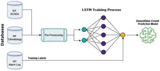 For supervised learning, training labels are required, and this is provided by the WT alarm logs. This is a binary categorical value, as either the WT will experience a downtime event or it will not. Taking the sequential nature of the data into account, the prediction model itself is a Long Short-Term Memory (LSTM). This is a recurrent neural network, which is well designed to deal with the sequential data formats while still being able to output binary/categorical predictions with the sigmoid activation function as the output neuron. This is understood to currently be among the best-performing methods for similar tasks [55,56,57].
