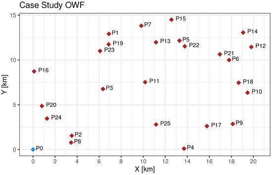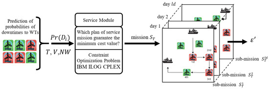 The probability of downtime occurrence for each WT (and the associated cost ) in the considered period of time T, forecasted in the prediction process (i.e., predictive maintenance), constitute input data for the service mission planning process (hereinafter referred to as ). The mission of interest is in this case the annual service visit, where it is expected that all WTs under consideration are visited and serviced. Knowing which WTs are characterized by a high probability of , you can plan a service mission in such a way as to prioritize them and prevent the upcoming risk of downtime. The service mission includes the allocation of available service teams to selected WTs and their transport using the available fleet of vessels. In the adopted planning process for this type of mission, the following assumptions were made [12]: