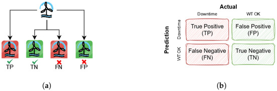 These figures show the prediction outcomes. Note that the red color represents a WT with imminent downtime event which is the positive event: (a) Discrete mapping of prediction outcomes; (b) a confusion matrix of prediction outcomes.