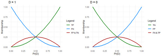 As an example, if and , then , which is evaluated with membership scores (according to Equations (9)–(12)) belonging to the TP class with level , to classes FP with level , FN with level , and TN with level . From this, it can be observed that even though the prediction score would evaluated to the true label in the discrete case, this approach will penalize the uncertain prediction scores in the membership evaluation.