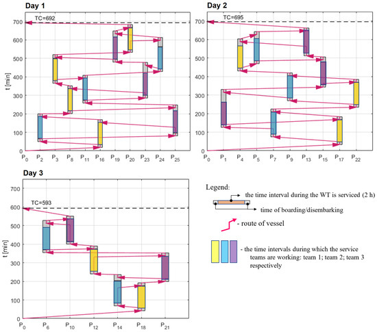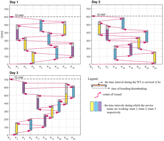Depending on the number of WTs requiring servicing, service missions last from one to several days. This means that the missions are subdivided into a sequence of one-day sub-missions , carried out on subsequent days of the considered period T: ), where denotes the number of sub-missions (number of mission days).
