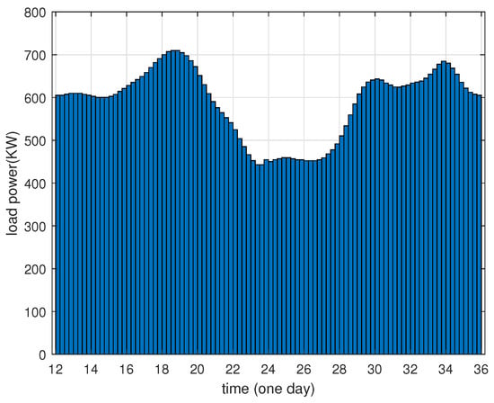 In this investigation, the load curve has been shifted forward by 12 h, resulting in a scheduling cycle from midday to midday on the subsequent day. Figure 2 shows the typical load curve of the local microgrid under the daily cycle scenario, in which the peak periods occur at around 18:00 h, 06:00 h, and 10:00 h. The maximum power demand is 710 kW, while the minimum power demand is 445 kW.