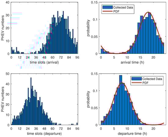 A normal distribution of PHEV charging behaviors can be derived from a random sample of 200 private EVs out of over 40,000 in Shenzhen for the investigation [28]. Following [28], the daily travel and charging information of EVs were obtained through an online questionnaire survey, and the collected charging data were used to determine the probability density distribution of their connection/disconnection time and state of charge (SoC) of batteries. Consequently, it is possible scientifically to simulate charging behaviors based on these data.