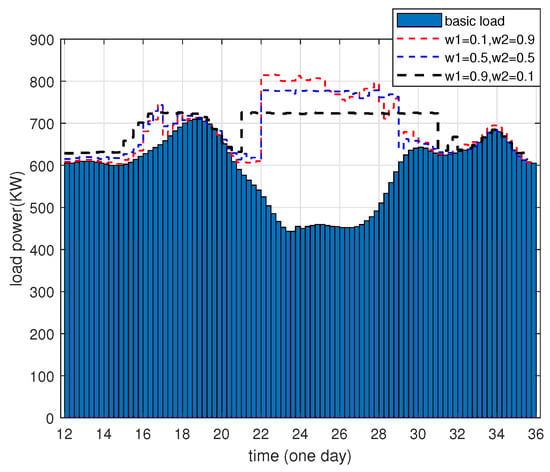 As illustrated in Figure 5, the application of the distinct cost weighting factor and load stabilization weighting factor gives rise to disparate load balance curves. In particular, as the cost weighting factor increases, PHEV owners are more inclined to charge during hours characterized by lower electricity prices (i.e., between 22:00 and 04:00 another day), which can further reduce charging costs. However, the load profile will exhibit greater fluctuations, particularly during the hours of centralized charging, and the overall peak-to-valley difference in the load profile will be greater.