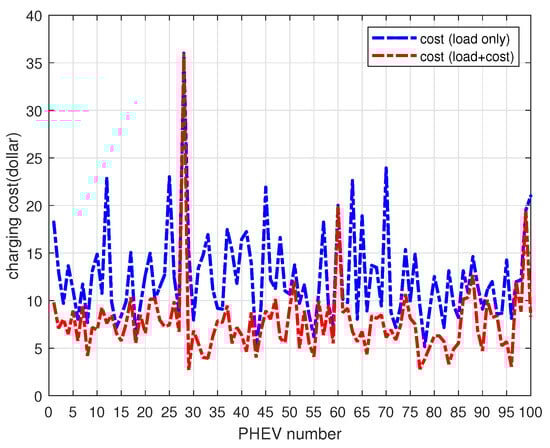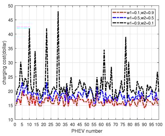 For this example of low-level penetration with 100 PHEVs, different load balance curves and charging cost curves are obtained by selecting different weight coefficients of objective functions. Specifically, since the cost function factors add up to 1, different weight factors will be emphasized in the objective function. The larger the load balance weight factor, the better the overall load balance of the power grid, but the higher the overall cost of electricity consumption. On the contrary, the larger the weight factor of electricity cost, the lower the overall cost of electricity consumption, but the greater the fluctuation of the overall load of the grid. Therefore, it is necessary to set a reasonable weight factor according to the actual situation in the power grid, so as to balance the interests of both sides of the power supply and the power side achieving a win–win situation in the future smart grid.