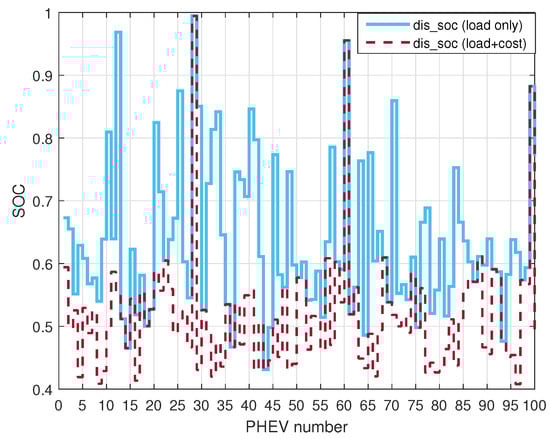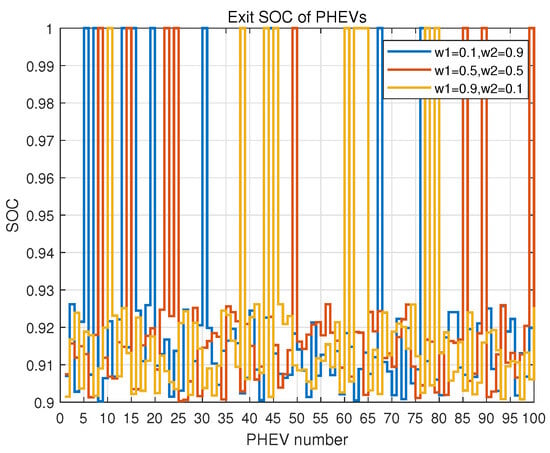 Figure 6 illustrates how the application of different cost weighting factors and load stabilization weighting factors can lead to differing charging costs. Overall, the smaller the cost weighting factor, the higher the charging cost spent (black dotted line). Conversely, the larger the cost weighting factor, the lower the charging cost spent (red dotted line). As can be observed in Figure 7, the SOC of all EVs at exit is above 90%, and the SOC of some EVs reaches 100%, which fulfills the charging demand of the owners.