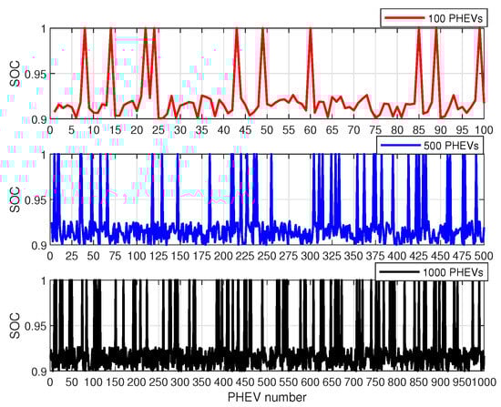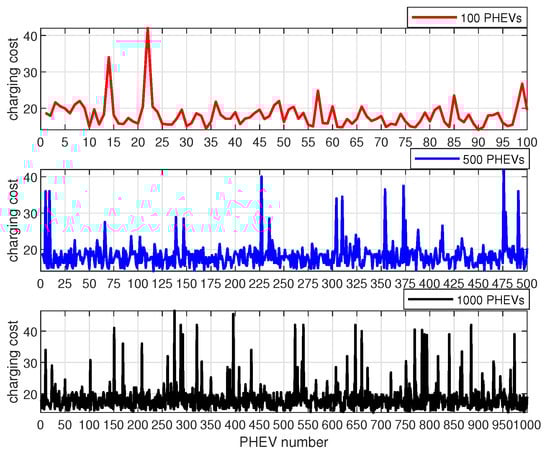 As the number of electric vehicles continues to increase, it is becoming increasingly apparent that the future smart grid must be equipped with the capability to accommodate large-scale electric vehicles. Furthermore, for PHEVs to be of significant value in the context of a flexible and mobile grid, it is necessary for them to be involved in large-scale clustering for load balancing and cost minimization. Moreover, large-scale clustering of PHEVs can further validate the robustness and effectiveness of the model proposed in this paper. Consequently, to verify the effectiveness of the proposed model based on the optimal optimization, a case of high-level penetration with 100 PHEVs, 500 PHEVs, and 1000 PHEVs is studied in this subsection. The simulation parameters are set in accordance with the specifications outlined in Table 1. And the weighting factors for load stabilization and cost minimization are set as . The simulation results are shown in Figure 8, Figure 9 and Figure 10.