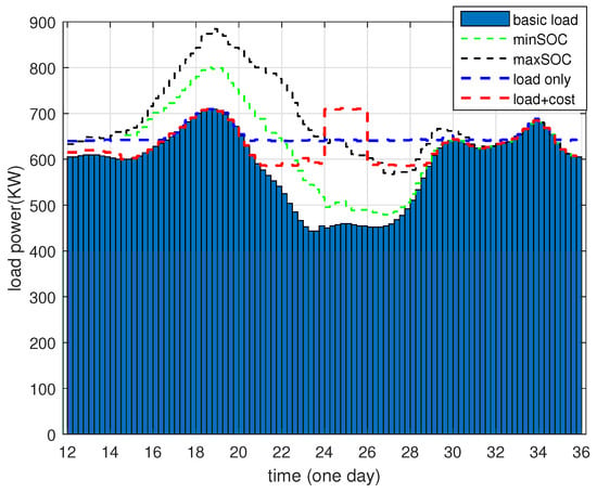Figure 11 illustrates the overall load profile obtained using a single-objective function, as referred in the literature [25]. The red dashed line represents the load profile obtained using the multi-objective function proposed in this paper, which considers both the minimization of load peak-to-valley difference and charging cost with the use of weighting factors. The red curve in the graph shows greater fluctuations, reaching its peak between 24:00 and 02:00 (on another day). This is because the electricity price is lowest during this time (i.e., 0.6 kWh/dollar). The model proposed in this paper focuses on charging during this period to meet the charging demand of PHEV owners.
