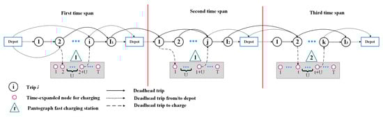 Our arc-based formulation is based on the following network where N includes the daily trips of the shuttle bus, the depot, O, and the time-expanded nodes of the pantograph charger, and A represents the feasible connecting arcs. The arcs in A are categorized into five types: depot-to-trip arcs from O to ; trip-to-trip arcs from to if (i.e., if the corresponding connection is feasible); trip-to-charger arcs from to the time-expanded node at the pantograph charger located at the Loyola campus, represented by F if ; charger-to-trip arcs from to if ; and trip-to-depot arcs from to O. Additionally, represents all potential arcs between trips and the charging station. The cost of an arc is defined as follows: depot-to-trip arcs have cost ; trip-to-charger arcs have cost where ; and trip-to-trip arcs have cost . As an example, an arc-based network for three time spans is illustrated in Figure 1. The proposed mathematical model optimizes one time span individually, using the list of trips derived from the headway value. In this model, we focus only on feasible trips between nodes, removing any infeasible connections between trips, the charging station, and the depot. This is carried out by considering the travel times between nodes and the duration of the trips.
