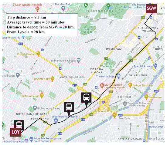 Concordia University, located in Montreal, Canada, is home to two campuses: Sir George William (SGW) and Loyola. SGW Campus houses 40 buildings and Loyola Campus comprises 27 buildings. During the 2022–2023 academic year, the university hosted 35,404 undergraduates and 10,084 graduates, totalling 45,488 students [58]. Many students rely on public transportation, the university’s shuttle bus, or personal vehicles for their daily commute. The shuttle bus service, free for Concordia’s students and staff, facilitates travel between the SGW and Loyola campuses from Monday to Friday according to a set schedule. The route of the shuttle buses, the real-time location of buses, and trip details provided by Concordia University’s Facility Management are illustrated in Figure 2.