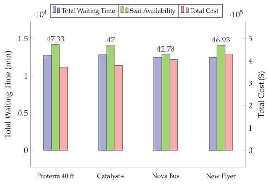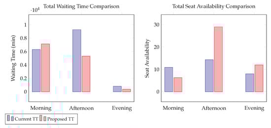 According to Table 2, both timetables maintain the same number of buses throughout the day. While the bus usage cost shows a substantial increase under the proposed timetable due to higher bus leasing costs, the fuel cost for current diesel buses is significantly higher than the electricity cost for EBs. It is important to note that the fuel costs for diesel buses include Quebec’s carbon tax, which is CAD 0.17 per litre of diesel [63]. Thus, the total operational costs for the proposed timetable using EBs are lower at different times of the day compared to the existing timetable with diesel buses. In terms of service quality, as shown in Figure 6, the proposed timetable slightly increases the waiting time in the morning but substantially reduces it in the afternoon and slightly in the evening, improving overall passenger satisfaction. Seat availability is significantly enhanced in the afternoon, suggesting better accommodation for peak-time ridership. Notably, the proposed timetable achieves zero carbon dioxide emissions, marking a significant step towards environmental sustainability. As a result, the proposed timetable and schedule not only aligns with environmental goals but also attempts to balance cost with improved level of service.