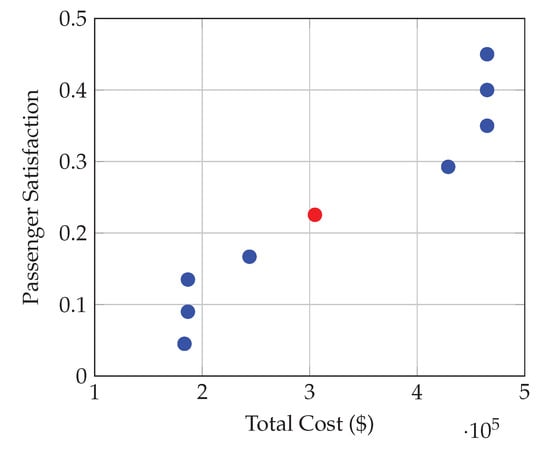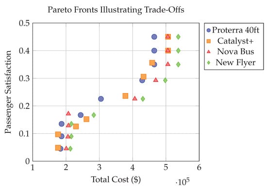 Another method for addressing such integrated problems is the Pareto front technique. This approach aims to identify the optimal Pareto front, a set of solutions where no other solutions can outperform any in the optimal set without compromising another criterion. Essentially, it enables decision makers to visualize trade-offs and make choices that best balance competing objectives, ensuring that every solution on the Pareto front represents an optimal balance of these objectives. Weiszer et al. [32] introduced a model focused on two goals, which were minimizing passenger wait times at each bus stop and reducing the number of buses required to cover all scheduled trips. In order to address TT and BSP, Ibarra-Rojas et al. [33] employed two mathematical formulations, yielding optimal headways and schedules. After that, they combined the two problems into a single bi-objective integrated problem. Teng et al. [18] developed a multi-objective particle swarm optimization (PSO) approach to address single-line bus timetabling and the bus scheduling problem for EBs. The authors focused on reducing both the total number of electric buses needed and the costs associated with charging them.