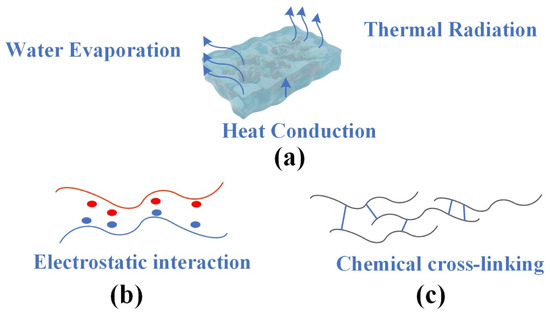 (a) Main heat transfer processes in hydrogel sweating; (b) electrostatic interaction type (c) chemical cross-linking type.