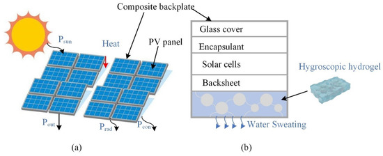 In recent years, hydrogels have garnered significant interest in the field of clean energy use, particularly in the areas of atmospheric water harvesting and solar energy collecting [51,52]. The very basic principle for hydrogel sweat cooling is illustrated in Figure 4. An innovative composite backplate has been developed based on hydrogel, which supports high-efficiency cooling performance during the working time. In addition, according to the hydrogel-commendable hygroscopic capacity, various studies have been explored, which indicate that hydrogel has the strong potential to be used as passive cooling of photovoltaic panels, solar evaporation and other energy conversion management devices [53]. This section will conclude the latest research in this field and review the useful outcomes.