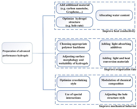 During the last section, the research status of hydrogel sweat cooling technology has been concluded based on its main application Though hydrogel shows capability in the thermal management of these field, there are still some challenges that need to be solved, such as the stability, durability, and cost [60]. Researchers have carried out a lot of work by improving the preparation process of hydrogels and optimizing their structural properties based on the cooling principle of whole process [61]. By reviewing the related latest study, this section is presented to track the potential research orientation in the hydrogel sweat cooling field, which includes the preparation of high-thermal-performance hydrogels, improvement in hydrogel hygroscopicity and a new way to study the cooling principle of hydrogel.