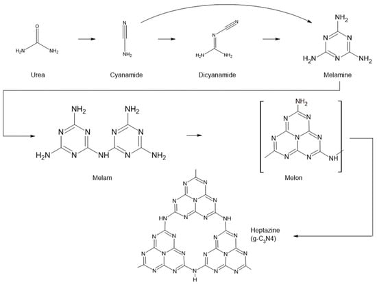 The pyrolysis method [52], also referred to as calcination [46], describes the process of heating precursors such as melamine [27] to initiate the polymerization reaction forming melam monomers, which connect to form the tri-s-triazine (heptazine) structure. Heptazine structures further condense, producing individual layers, stacked on top of each other. Pre-grinding of melamine and urea prior to the application of heat has been documented [27,36,40].
