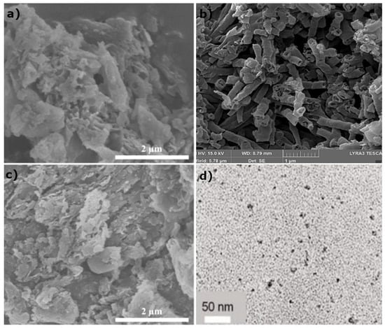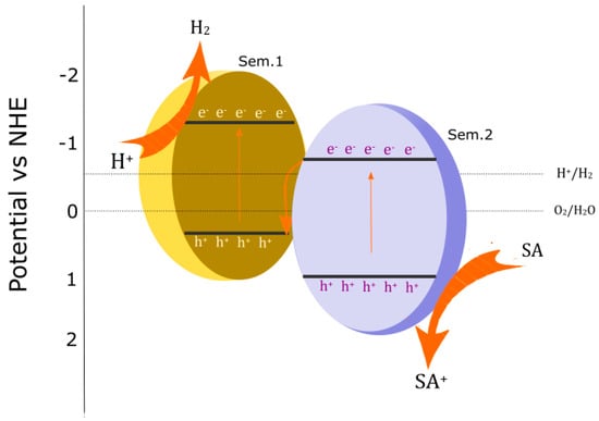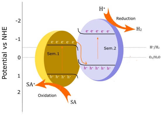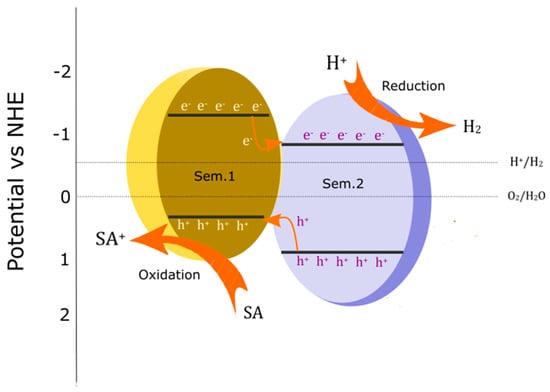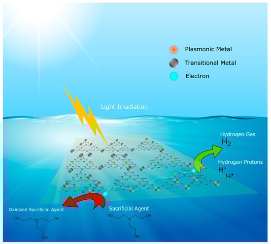 As a result of accelerated industrialization and the use of fossil fuels [1,2], each year, massive amounts of greenhouse gases such as CO2, SOx, and NOx are released into the earth’s atmosphere, with the increasing degradation of the natural environment presenting many dangers to human health [3,4] and significant harm to natural ecosystems. Furthermore, the limited availability of such fuels is a major problem [5], with several approaches being applied in the field of energy, such as storage or the use of renewable energy sources [6,7,8]. Hydrogen energy as a promising clean alternative has the potential to contribute to a sustainable carbon-neutral future [9] due to its high energy density [10]. Although there are many methods for hydrogen (H2) production, with the most common being electrolysis [11,12,13], there has been a surge in research regarding the technique of photocatalysis. Photocatalysis is an environmentally friendly method that requires only natural sunlight for its operation and can be utilized for a variety of applications from water decontamination to water splitting [14,15,16,17]. The general process of photocatalysis involves the irradiated generation of charged pairs: After the irradiation of a semiconductor via a light source with photon energy above the material’s band gap, the electrons in the valence band (VB) are excited and transferred to its conduction band (CB). This creates an electron/hole pair in the respective VB/CB of the material, which can then be used for catalytic reactions (reduction/oxidation of molecules). The basic qualities required of a proper photocatalyst are good light response and efficient charge generation, separation, and transfer capabilities, along with stability, energy level positions, and high specific area. It is desirable for a photocatalyst to be able to absorb low-energy photons (from the visible light spectrum), in addition to high-energy UV light, as a great percentage of natural sunlight belongs in this wavelength range. Furthermore, it is necessary to have good charge separation characteristics as one of the most common issues in photocatalysis is recombination. The tendency of photogenerated electrons to combine with holes in the VB impairs the material’s function as there are fewer species available to participate in the desired photocatalytic reactions. Finally, the positions of the material’s energy levels define its ability to perform the necessary redox reactions.