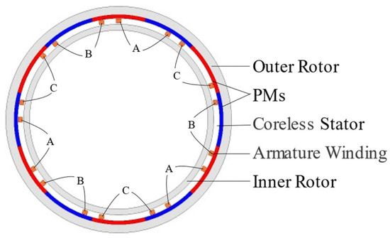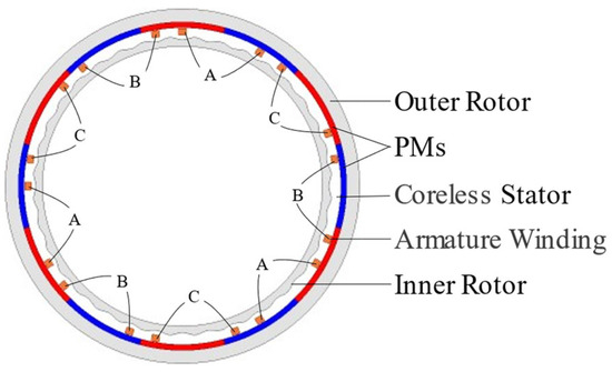 Among various kinds of electric machines, hollow-cup machines (HCMs) have been successfully used in such applications [4,5]. The armature winding of a conventional HCM is assembled on the coreless stator. The inner rotor and outer rotor are located on different sides of the stator. Tile-shaped permanent magnets (PMs) are placed on the core of the outer rotor, and the inner rotor only consists of the rotor core. Due to the absence of the stator core, the slot-effect caused by the alternation of ferromagnetic teeth and non-magnetic slots in HCMs is negligible, resulting in low cogging torque and core loss.