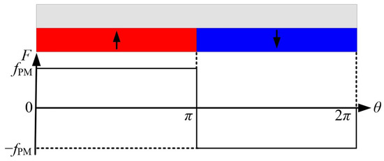 The topology of conventional HCMs is shown in Figure 1. To analyze the harmonic orders of air-gap flux density, an MMF permeance model introduced in [24] was employed. For simplicity, flux leakage and magnetic resistance of the iron core were neglected in the model. Figure 2 shows the simplified air-gap MMF generated by tile-shaped PMs; its Fourier expansion FPM can be expressed as: