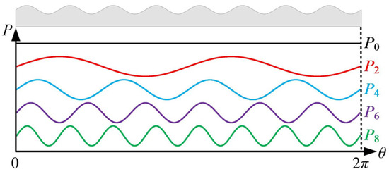 Equation (5) infers that the (2k − 1)th harmonic of FPM and mth harmonic of air-gap permeance will produce the (2k − 1 ± m)th harmonics of air-gap flux density. Moreover, the amplitudes and phases of air-gap flux density harmonics will vary with the amplitudes and phases of air-gap permeance harmonics. For instance, Table 1 lists the harmonic order of air-gap flux density produced by several PM-generated air-gap MMF and air-gap permeance harmonics. The higher the harmonic order, the lower the amplitude. Hence, this paper only considers the first, third, fifth, and seventh PM-generated air-gap MMF harmonics (designated FPM1, FPM3, FPM5, and FPM7, respectively). Injecting the second, fourth, sixth, or eighth harmonics (designated P2, P4, P6, and P8 shown in Figure 3, respectively) into the air-gap permeance produces the fifth and seventh harmonics of air-gap flux density, which may effectively suppress torque ripples. Therefore, this paper mainly focuses on these four injected harmonics. However, it should be noted that if the machine is assembled with consequent-pole PMs, the PM-generated air-gap MMF will contain even-order harmonics. In this case, the odd-order harmonics of air-gap permeance can be injected to produce the extra fifth and seventh air-gap flux density harmonics.