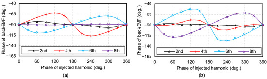 Phases of back-EMF harmonics versus phases of second, fourth, sixth, and eighth injected harmonics. (a) Fifth back-EMF harmonic; (b) seventh back-EMF harmonic.