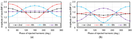 Amplitudes of back-EMF harmonics versus phases of second, fourth, sixth, and eighth injected harmonics. (a) Fifth back-EMF harmonic; (b) seventh back-EMF harmonic.