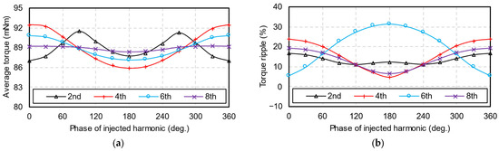 Torque performance versus second, fourth, sixth, and eighth injected harmonic phases. (a) Average torque; (b) torque ripple.