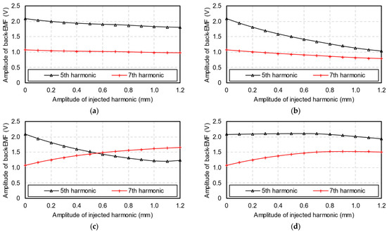 Amplitudes of the fifth and seventh back-EMF harmonics versus amplitudes of injected harmonics. (a) Second injected harmonic; (b) fourth injected harmonic; (c) sixth injected harmonic; (d) eighth injected harmonic.