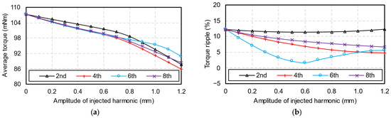 Torque performances versus amplitudes of second, fourth, sixth, and eighth injected harmonics. (a) Average torque; (b) torque ripple.