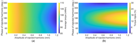 To determine the best inner rotor shape for HCMs, the parameters of four injected harmonics were optimized, and their corresponding machine performances were compared. Using the sixth injected harmonic as an example, torque performance under different injected harmonic parameters is calculated in Figure 10. When the machine exhibits the lowest torque ripple, the corresponding amplitudes and phases of the injected harmonics were selected as the optimized values. Table 3 summarizes the optimized parameters for four injected harmonics.