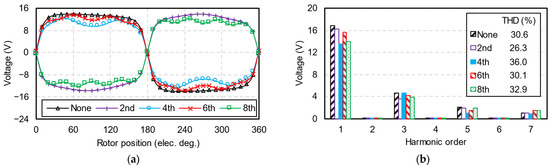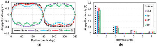 Figure 11 compares the open-circuit air-gap flux densities of HCMs, where conventional HCMs without harmonic injection are designated as None. Due to the increased equivalent air-gap length, the fundamental components of four machines with injected harmonics are decreased. Due to the injected harmonics, these machines show different characteristics of air-gap flux density harmonics. For instance, the machine injected with the sixth harmonic exhibits an air-gap density that is 31% lower than the fifth harmonic, but 40% higher than the seventh harmonic compared to conventional HCMs. Consequently, the amplitudes of the fifth and seventh air-gap flux density harmonics in this machine are similar.