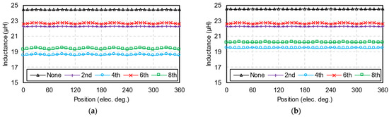 The open-circuit inductances of five machines are shown in Figure 12. Compared to conventional HCMs, HCMs with sinusoidal inner rotors exhibit lower inductances due to increased equivalent air-gap lengths. Moreover, the uneven air-gap length also leads to differences between d-axis and q-axis inductances, especially for machines injected with fourth and eighth harmonics. This finding indicates that when the d-axis current is not zero, these HCMs produce reluctance torque and their average torque may increase. However, the Id ≠ 0 condition can also cause higher torque ripples.