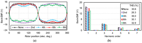 On the other hand, as shown in Table 1, several interactions can produce the fifth harmonic of air-gap flux density, i.e., interactions between FPM1 and P4, FPM1 and P6, FPM3 and P2, FPM3 and P8, etc. The seventh harmonic of air-gap flux density can be produced by interactions between FPM1 and P6, FPM1 and P8, FPM3 and P4, FPM5 and P2, etc. Since FPM1 is the fundamental component of PM-generated air-gap MMF, its amplitude is much larger than FPM3 and FPM5. Therefore, as shown in Figure 5 and Figure 6, the fifth back-EMF harmonic is mainly influenced by the fourth and sixth injected harmonics, whereas the seventh back-EMF harmonic is mainly influenced by the sixth and eighth injected harmonics.