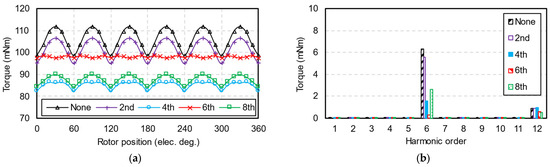 Figure 7 shows the influences of injected harmonics on torque performance. Both average torque and torque ripples vary with injected harmonic phases. As previously mentioned, the fourth, sixth, and eighth injected harmonics have significant influences on the fifth or seventh back-EMF harmonics. Thus, these three injected harmonics can effectively adjust the torque ripple, while the second injected harmonic’s influence on the torque ripple is minimal.
