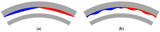 In addition, changing the PM shape can also adjust the air-gap flux density harmonics. For tile-shaped PMs, the outer and inner surfaces of a single PM are arcs, and their centers are the same. A kind of bow-shaped PM was proposed in recent years. For this PM shape, the centers of the outer and inner surfaces are different. By adjusting the distance between two centers, the harmonics of air-gap flux density can be effectively reduced [15,16]. Moreover, bow-shaped PMs can suppress total harmonic distortion (THD) of phase back-EMF [17]. Furthermore, the PM shape can be optimized by injecting harmonics based on PM thickness. For instance, when the fifth or seventh harmonic is injected, the original fifth or seventh magnetomotive force (MMF) harmonic generated by tile-shaped PMs will be suppressed, resulting in a more sinusoidal air-gap flux density and phase back-EMF [18,19].