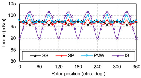 Figure 17 compares the torque waveforms of HCMs with proposed inner rotor and PM-shaping methods. In addition to PM-shaping methods, some conventional methods can suppress torque ripple, such as skewing the slots, shortening the winding pitch, reducing PM width, and increasing air-gap lengths, which are designated as SS, SP, PMW, and IG in this section, respectively. Figure 18 shows the torque waveforms of HCMs using conventional methods. Table 5 summarizes the torque characteristics of these machines. Compared to conventional methods, the sinusoidal-shaped inner rotor proposed in this paper not only suppresses torque ripple but also has a relatively higher average torque.