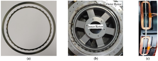 Photos of the prototype machine. (a) Laminations; (b) rotors; (c) stator.