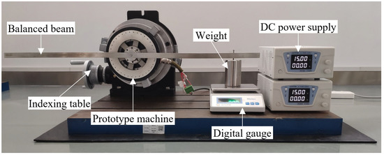 An HCM with the proposed sinusoidal-shaped inner rotor was manufactured. The inner rotor core thickness function was injected with the sixth harmonic. Photos of the prototype machine are shown in Figure 19. During the measurement of phase back-EMFs, the prototype machine was open-circuited and a servo motor was employed to drive the rotor of the prototype machine. The measured data was obtained by an oscilloscope. On the other hand, a static test rig introduced in [25] was used to measure the rated torque of the prototype machine. Figure 20 shows a photo of the static test rig. The rotor position of the prototype machine is locked by a balanced beam and weight. The stator position of the prototype machine can be manually adjusted and locked by an indexing table. A DC power supply powers the winding on the prototype machine. During the measurement, the stator position was adjusted step by step. The injected DC current was also adjusted step by step. The relationship between stator position and injected current is consistent with the Id = 0 control strategy. The prototype machine’s output torque will act on the weight through the balanced beam. When the prototype machine outputs torque, the digital gauge reading will vary. Therefore, output torque can be measured by reading the digital gauge.