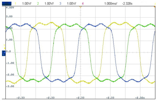 A screenshot of measured phase back-EMFs is shown in Figure 21. Figure 22 compares the 2D FE-predicted and measured phase back-EMFs. The 2D FE-predicted and measured back-EMFs have similar waveforms, while the fundamental component of the measured results is 7% lower than the 2D FE prediction, mainly caused by end leakage. Since the HCM has a large air-gap length but a short axial length, it suffers from the perceptible end effect. Furthermore, the amplitudes of measured fifth and seventh back-EMF harmonics are unequal, and the three-phase back-EMFs are slightly unbalanced, possibly caused by imperfect manufacturing.