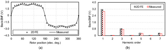 Comparison between 2D FE-predicted and measured phase back-EMFs below 2000 rpm. (a) Waveforms; (b) spectra.